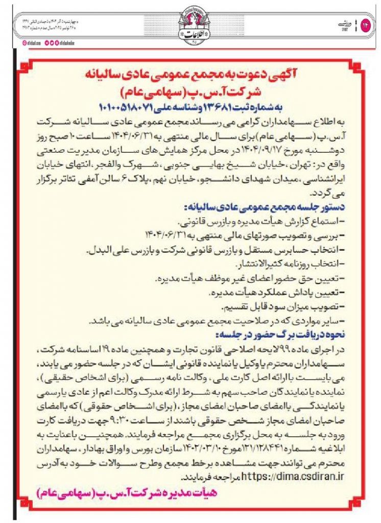 آگهی دعوت به مجمع عمومی عادی سالیانه برای سال مالی منتهی به 1404/06/31